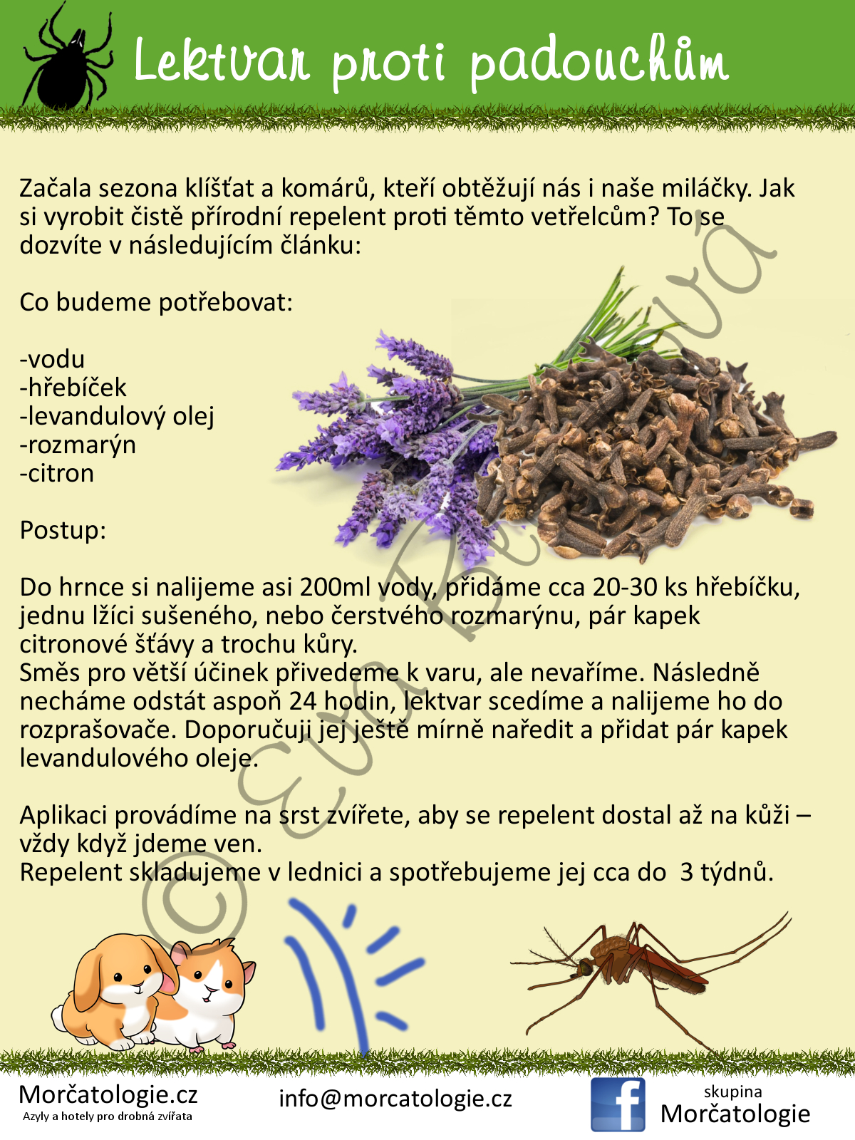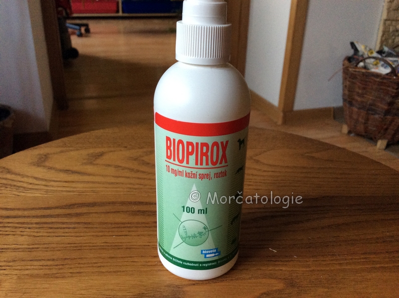 | Parazité vnější | Bio-Kill kožní sprej (oranžový). A na prostředí Bio-Kill na prostředí (žlutý), ocet. | Aplikace podle návodu na obalu, může se lišit v důsledku množství obsahu. | Domácí repelent proti klíšťatům a komárům. | |